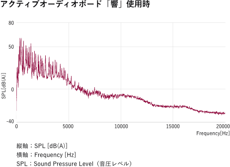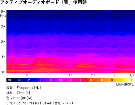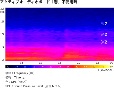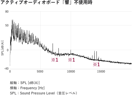 アクティブオーディオボード「響」不使用時は※1や※2のようにノイズの発生が見られますが、アクティブオーディオボード「響」使用時にはノイズが軽減していることがわかります。