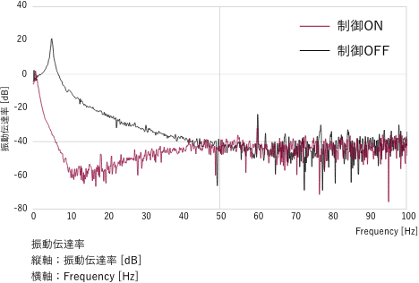 それに対して、制御を掛けることで全域で床などのからの外乱振動よりも機器の振動が小さくなり、全ての周波数で優れた性能が得られます。